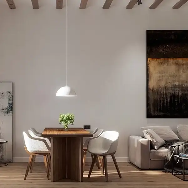 El dúplex en la planta baja del edificio frente a la calle Hostal de Sant Antoni, tiene una cocina, comedor y sala de estar en la planta inferior y en la planta superior una habitación, baño y estudio. También tiene acceso a la terraza comunitaria en la azotea y a los servicios de la planta baja.